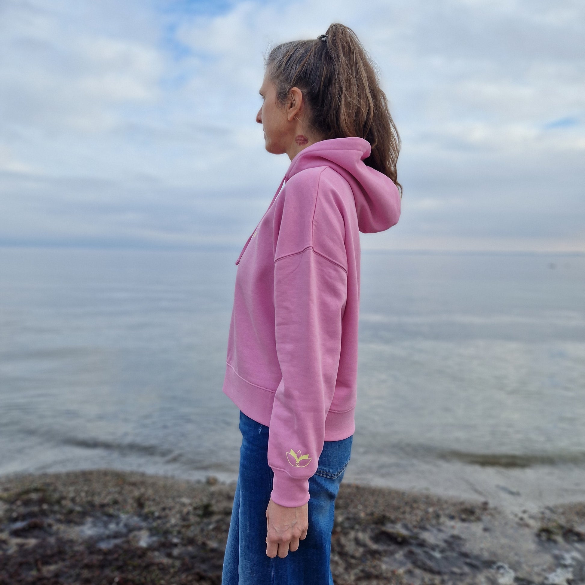 Dieser Damen-Hoodie vereint Komfort und Stil auf perfekte Weise. Mit überschnittenen Schultern, bestickten Ösen und feinen Kordeln wirkt er eleganter als ein klassischer Unisex-Hoodie. Der Verzicht auf eine Kängurutasche sorgt für eine schlanke, schmeichelhafte Silhouette, während die angepasste Länge ideal auf die weibliche Figur abgestimmt ist.