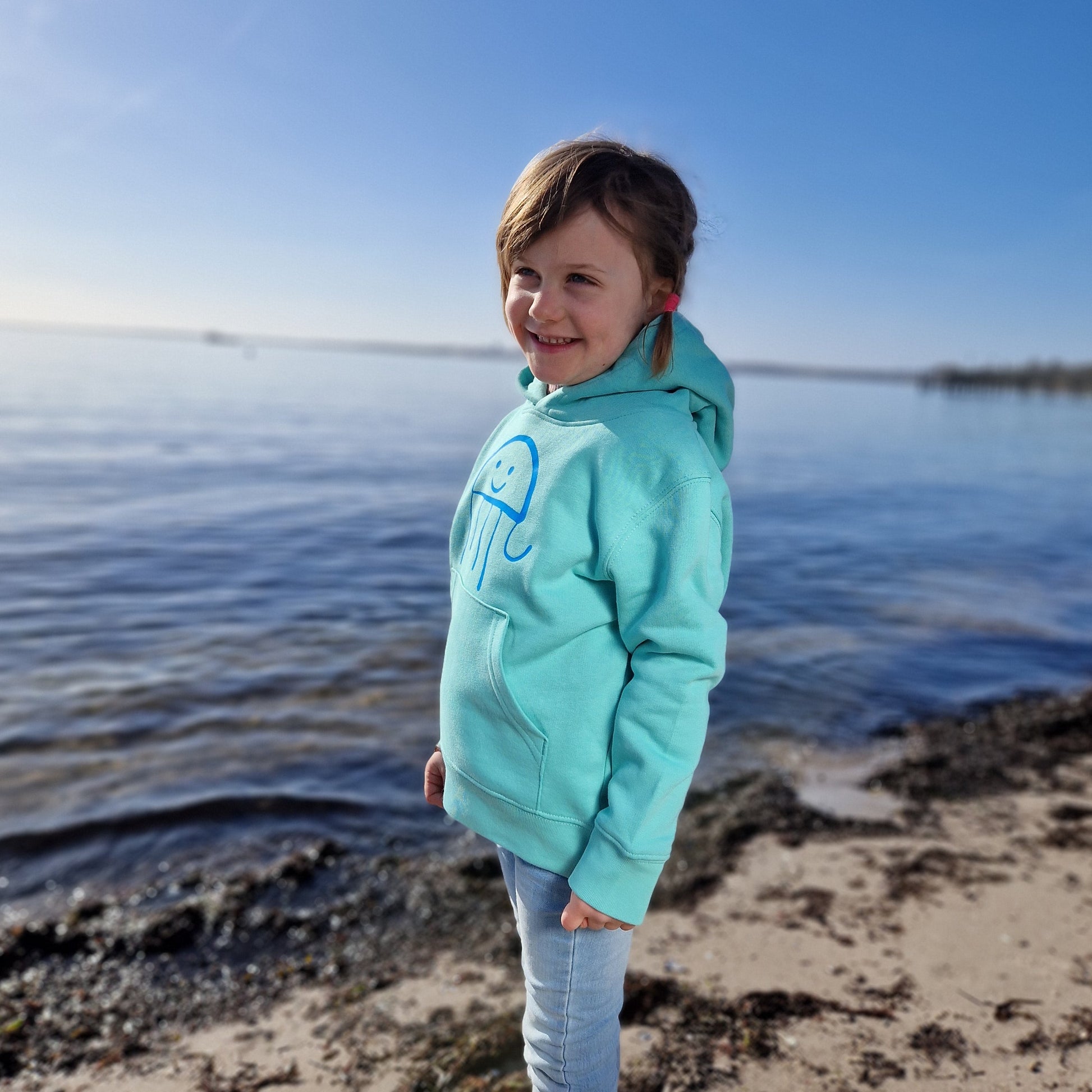 Verspielter Kinder-Hoodie mit einer von Sylvie handgezeichneten Qualle. Das liebevolle Meeresmotiv bringt Leichtigkeit und eine Portion Ostsee-Feeling in den Alltag. Weich, gemütlich und perfekt für kleine Meeresfans.