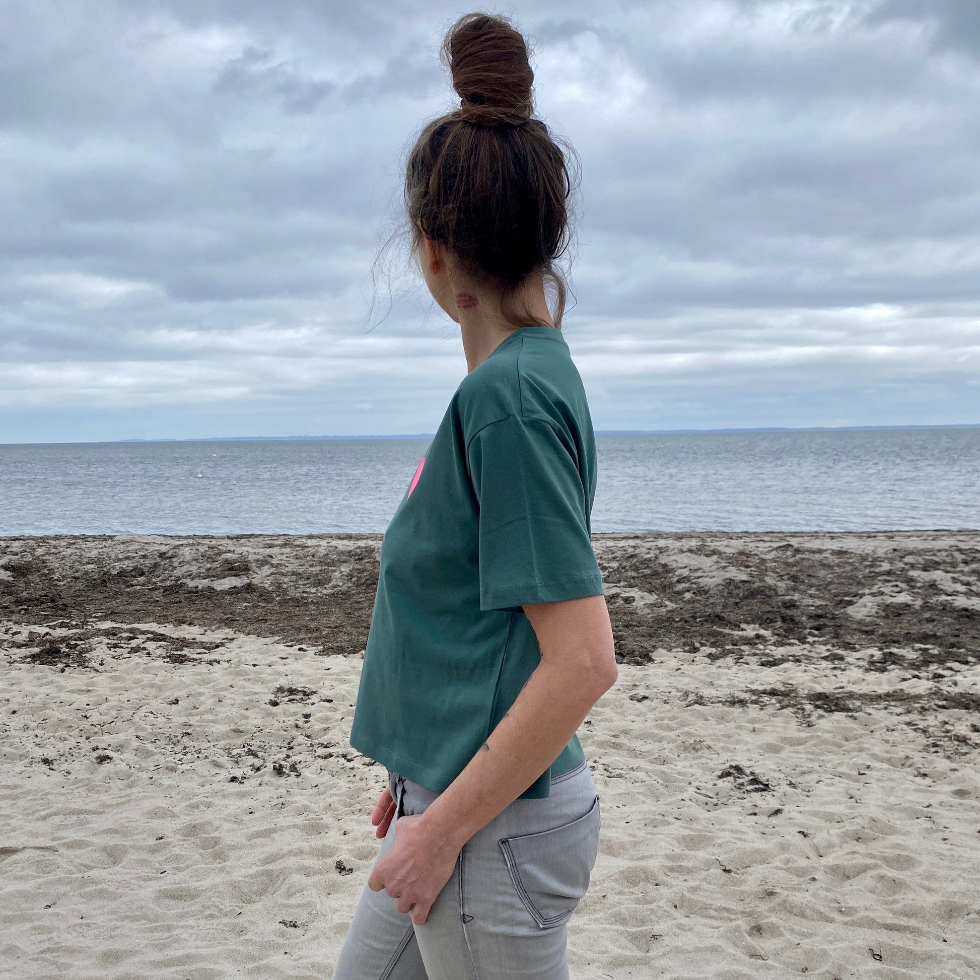 Der lockere, leicht verkürzte Schnitt mit überschnittenen Schultern verleiht dir einen entspannten und trotzdem urbanen Look. Ob zur High-Waist Jeans, zur lässigen Stoffhose, zur Shorts oder zur Yogaleggings – unser Cropped Herz T-Shirt passt sich deinem Style an.